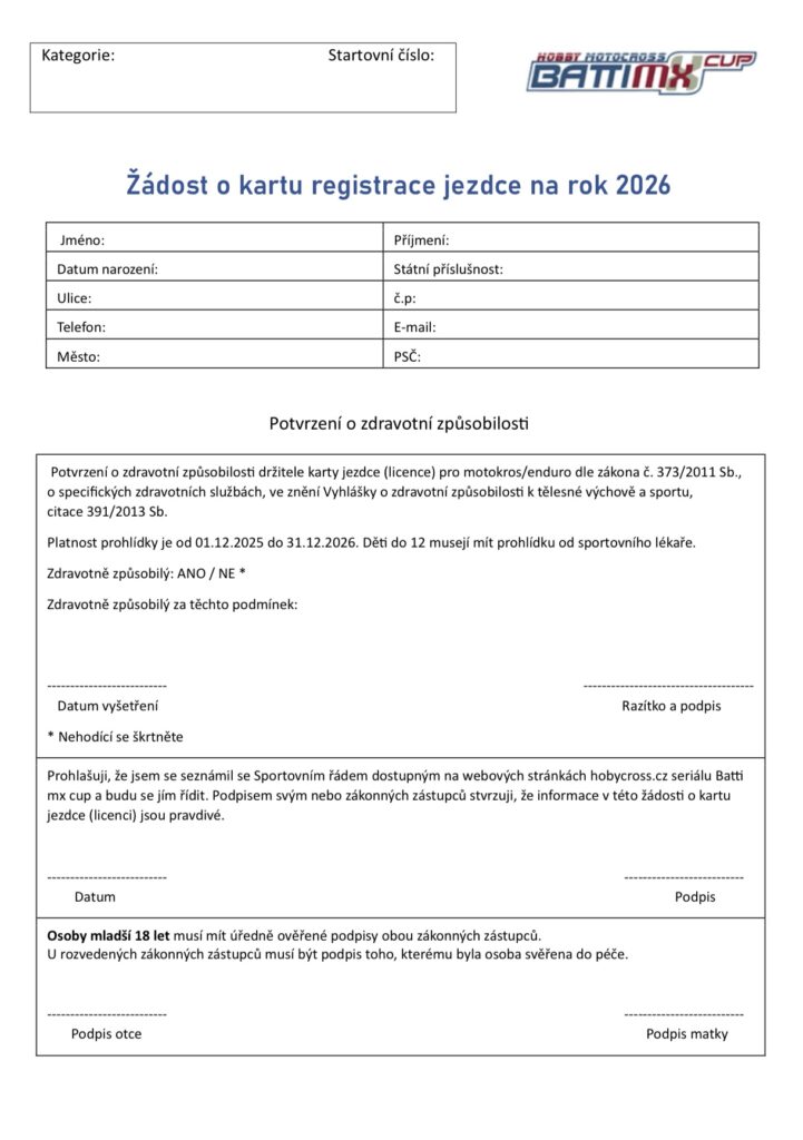 Vyplněnou žádost o registraci jezdce 2026 zasílejte , tak jako doposud poštou : Lenka Schlenzová, Doksany 54,41182. Nebo emailem : batti2@seznam.cz
